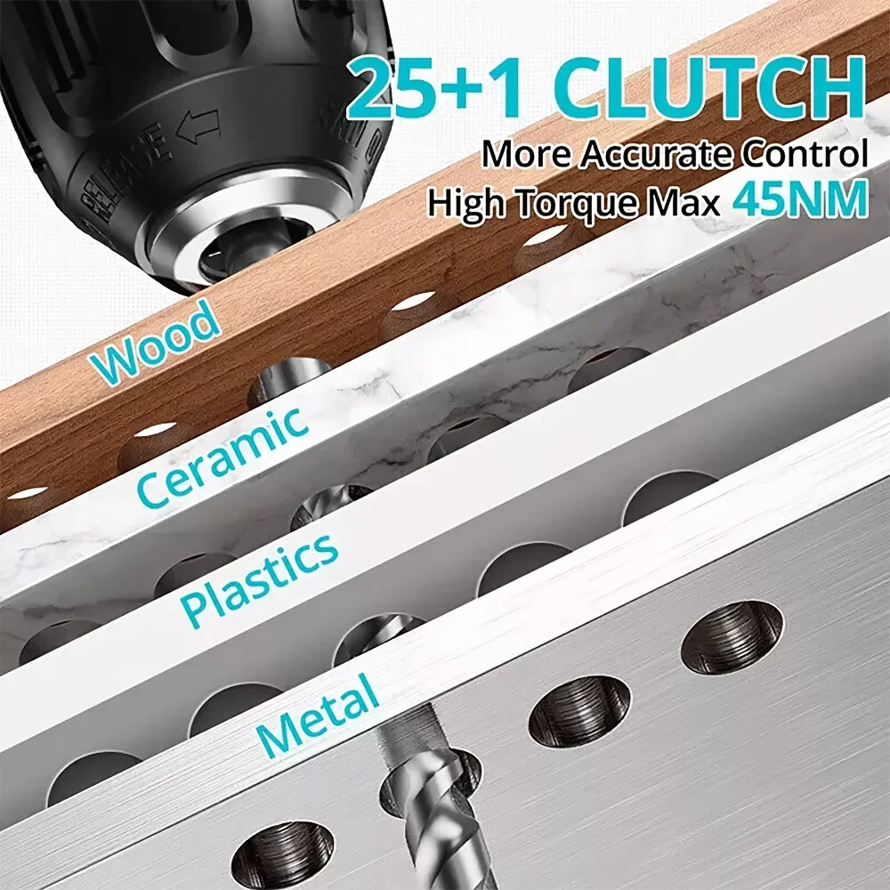 Esta furadeira possui configuração de torque 25 + 1 e duas opções de velocidade (0-450 e 0-1500 rpm), permitindo aos usuários escolher a velocidade ideal para diferentes tarefas.Ideal para projetos domésticos de bricolage e artesanato, esta furadeira sem fio é um ótimo presente para você, família ou amigos.